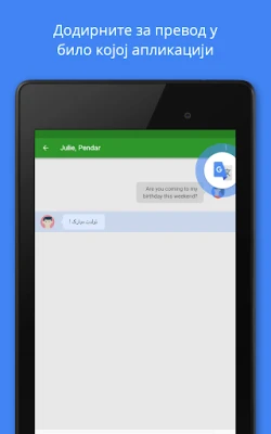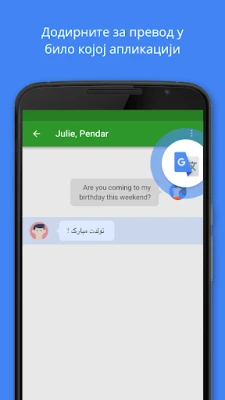 Iskusite neposrednost prevođenja na svakom koraku. Jednostavno kopirajte tekst iz bilo koje aplikacije i dodirom ikone "Google преводиоца" dobijte trenutni prevod za sve jezike. Kada vam je potrebno brzo rešenje u stvarnom svetu, usmerite kameru ka štampanom tekstu za trenutan vizuelni prevod na preko devedeset jezika. Za preciznije rezultate, snimite ili učitajte fotografije i prevodite ih na više od devedeset jezika. Dvojezični razgovori odvijaju se glatko uz funkciju simultanog prevođenja za sedamdeset jezika, dok vam opcija pisanja rukom omogućava da crtate karaktere umesto kucanja, podržavajući skoro sto jezika.