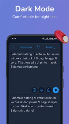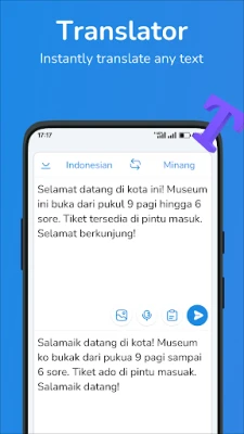 Otkrijte snagu interaktivnog prevođenja uz Prevodilac Indonežanski-Minang. Samo izgovorite svoje misli, a naša funkcija prepoznavanja prirodnog govora će ih istog trena prevesti u tekst i pružiti vam precizan prevod na minang ili indonežanski jezik. Uronite u pravi dijalog koristeći režim razgovora, koji omogućava prevođenje u realnom vremenu za fluidne dvojezične interakcije. Osim toga, transformišite vizuelni svet oko sebe: uslikajte tekst sa fotografija, natpisa ili dokumenata i trenutno dobijte kompletan prevod sadržaja zahvaljujući inovativnoj mogućnosti prevođenja slika i dokumenata.