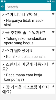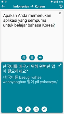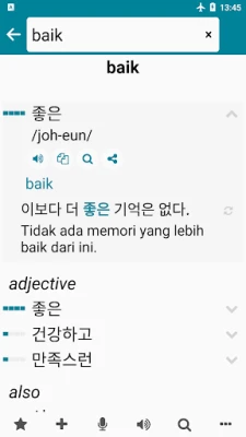Integrisani rečnik omogućava trenutno prevođenje između korejskog i indonežanskog, funkcionišući potpuno van mreže sa bazom od preko 98.000 korejsko-indonežanskih i 78.000 indonežansko-korejskih reči i izraza. Funkcija glasovnog prepoznavanja olakšava pretragu, a sistem automatski nudi predloge dok kucate. Reči su sortirane po učestalosti upotrebe sa procentualnim prikazom, uz primere rečenica za lakše razumevanje konteksta. Sve vaše pretrage se automatski čuvaju u istoriji, a omiljene reči možete izdvojiti za dodatno, ciljano učenje kroz testove i igre. Za opširnije tekstove, tu je i online prevodilac sa glasovnom opcijom, koji takođe čuva vaše prevode.